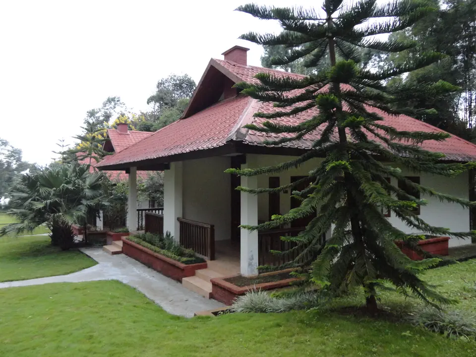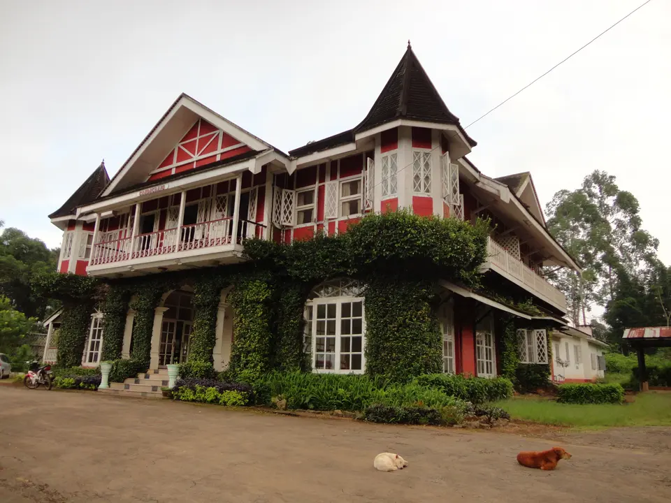 Een fraai Engels landhuis. In dit stijlvolle historische gebouw kun je nu logeren, maar de bungalows in de tuin rondom deze cottage zijn ook leuk! Het is bijzonder om hier te logeren, niet zozeer qua luxe, maar wel voor de sfeer. Je waant je even in de koloniale tijd. Dit is één van de leukste middenklasse hotels in Pyin Oo Lwin. Het landhuis is aan de buitenkant rood geschilderd.