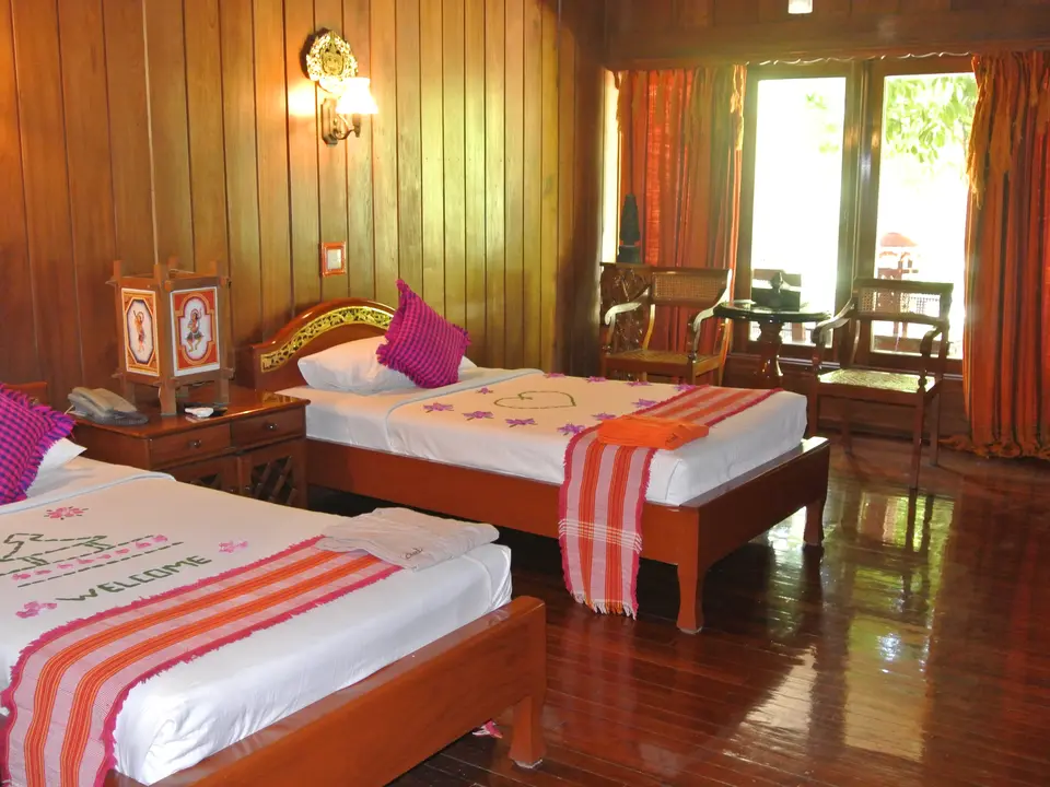 Rondom 2 tuinen zijn 67 kamers in geschakelde bungalowstijl gegroepeerd en gelegen in de mooi aangelegde tuin. Alle kamers hebben een veranda. De inrichting van de kamers is erg leuk. Het is echt in Myanmar-stijl met veel hout, houtsnijwerk, parasolletjes, lakwerk en schilderijtjes uit de omgeving. Alle kamers beschikken over een televisie, föhn, airco en minibar. De badkamers zijn doelmatig ingericht met een bad/douche, wastafel en toilet. De faciliteiten in alle kamers zijn gelijk. De superior kamers zijn alleen wat kleiner dan de deluxe kamers.