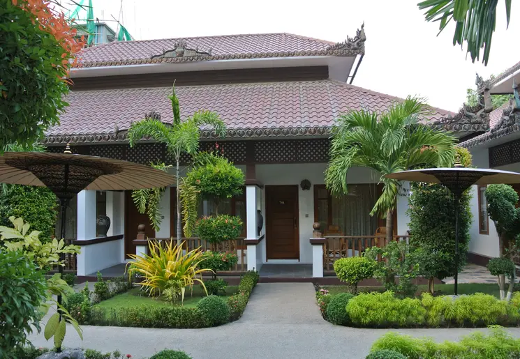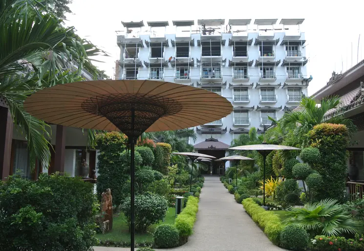 Wat een leuk hotel! Echt verrassend zo midden in de grote stad Mandalay. Je wandelt via een mooie tuin richting het hoofdgebouw. Dit gebouw was van origine 3 verdiepingen, maar zij zijn op dit moment bezig er 2 verdiepingen bovenop te bouwen. Alsnog is het geen lelijke flat waar je tegenaan kijkt, maar een fraai ogend gebouw met Birmese details.