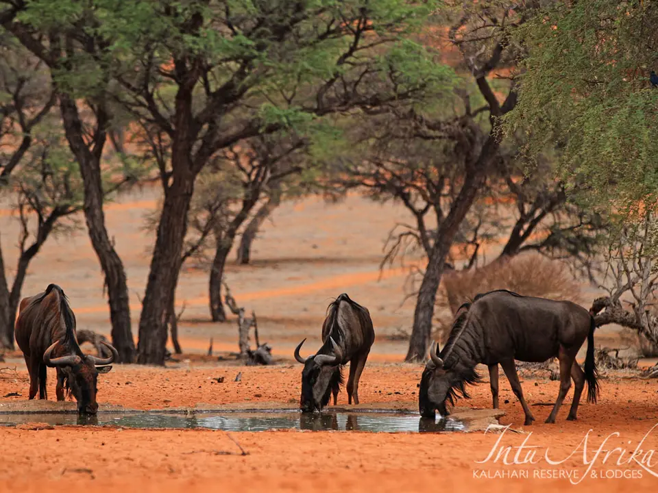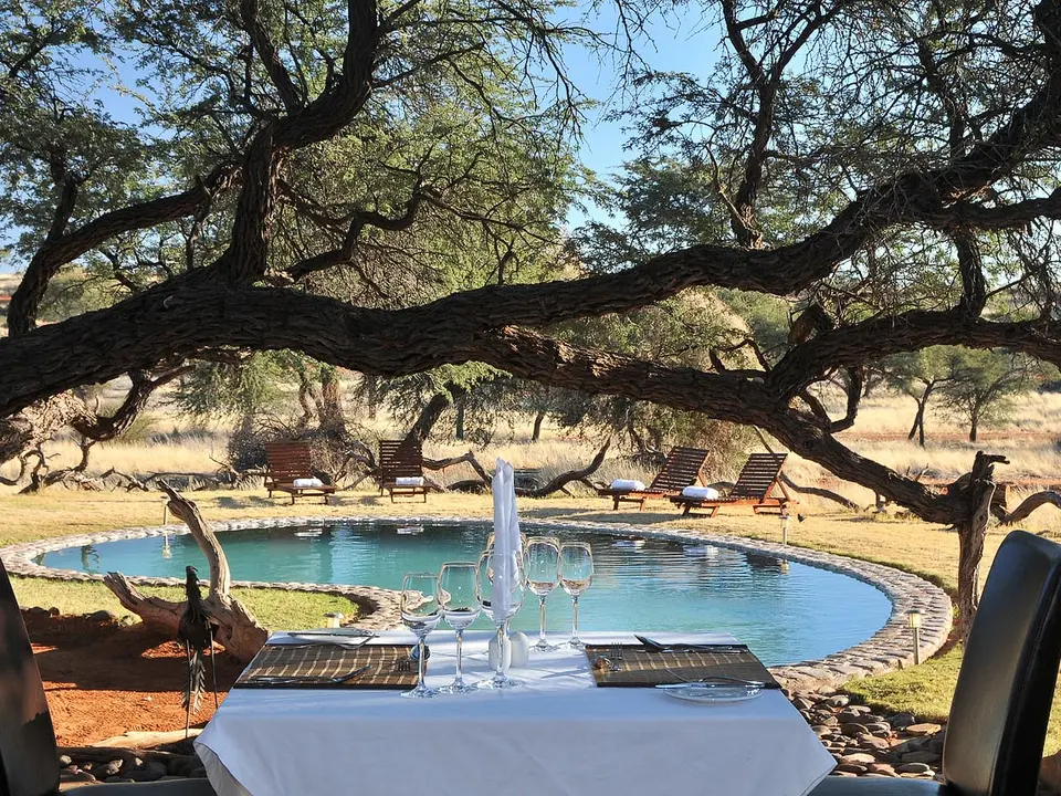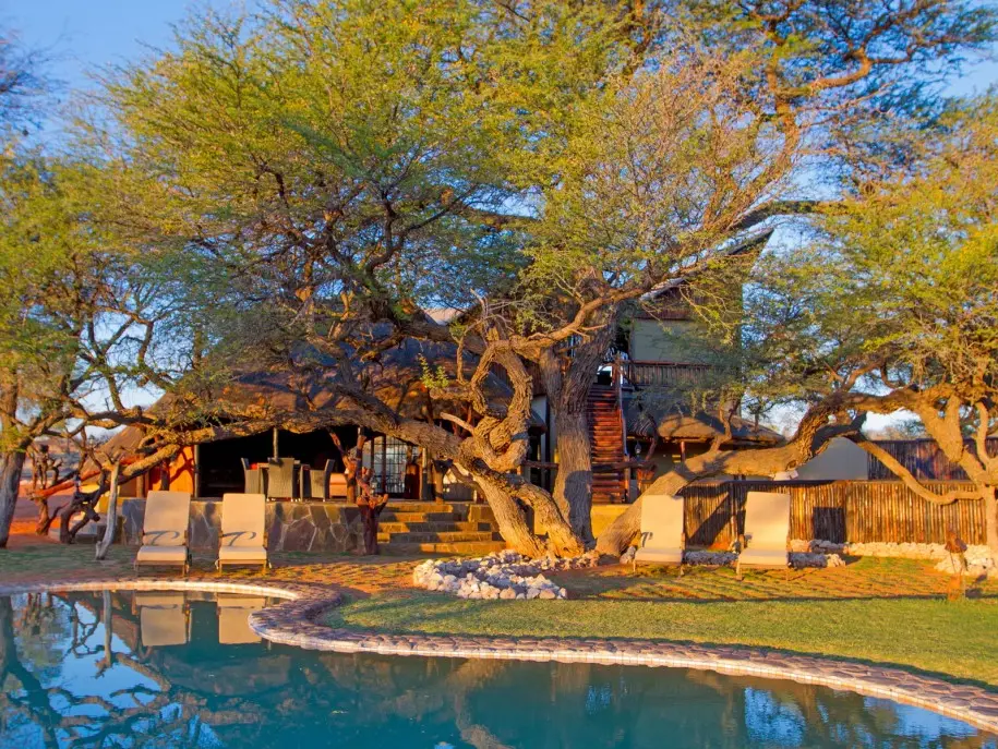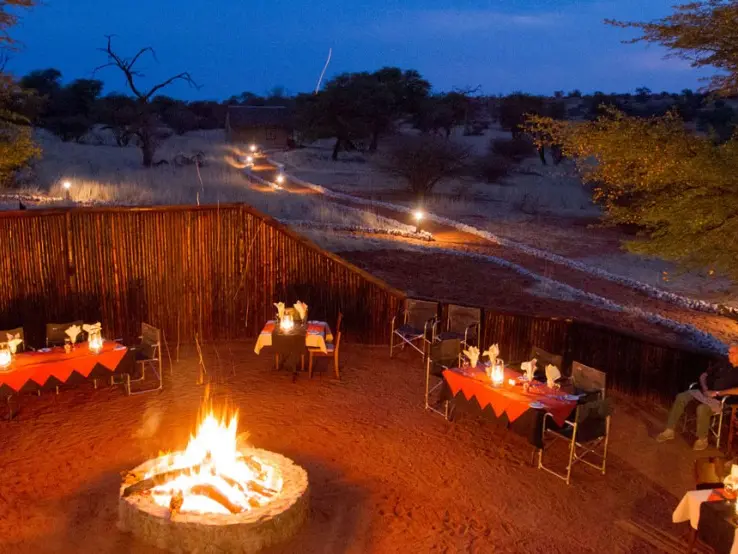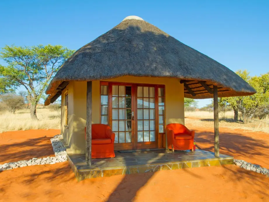 Camelthorn Kalahari Lodge is volop omringd door endemische kameeldoornbomen. Een passende naam voor een lodge op deze sfeervolle plek tussen twee rode zandduinen, vind je ook niet? Het hoofdgebouw met zijn rieten dakbedekking herbergt de receptie, het restaurant, de bar en lounge met luie lederen fauteuils. Gerechten in het restaurant worden bereid met verse groentes van een nabijgelegen boerderij. Buiten in de boma, kun je ’s avonds onder maan en sterren bij fakkelvuur van je diner genieten. Je vult je dagen met safari’s per landrover of te voet in het wildreservaat. Tussendoor kun je verkoeling zoeken in het zwembad. Camelthorn Kalahari Lodge heeft twee zusjes in hetzelfde wildreservaat (Zebra Kalahari Lodge en Suricate Tented Camp).