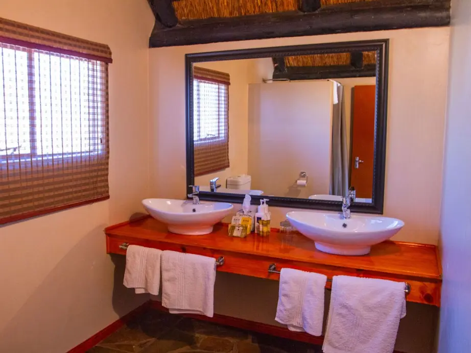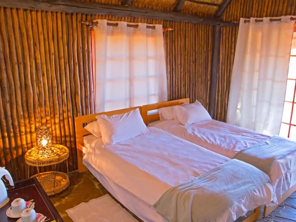 12 knusse, lemen huisjes met een rieten dak, ver van elkaar verspreid rondom het hoofdgebouw. Binnen tref je een tweepersoonsbed of twee aparte bedden en een redelijk grote badkamer met douche en toilet. Vanwege het hoge plafond lijkt de kamer extra groot.