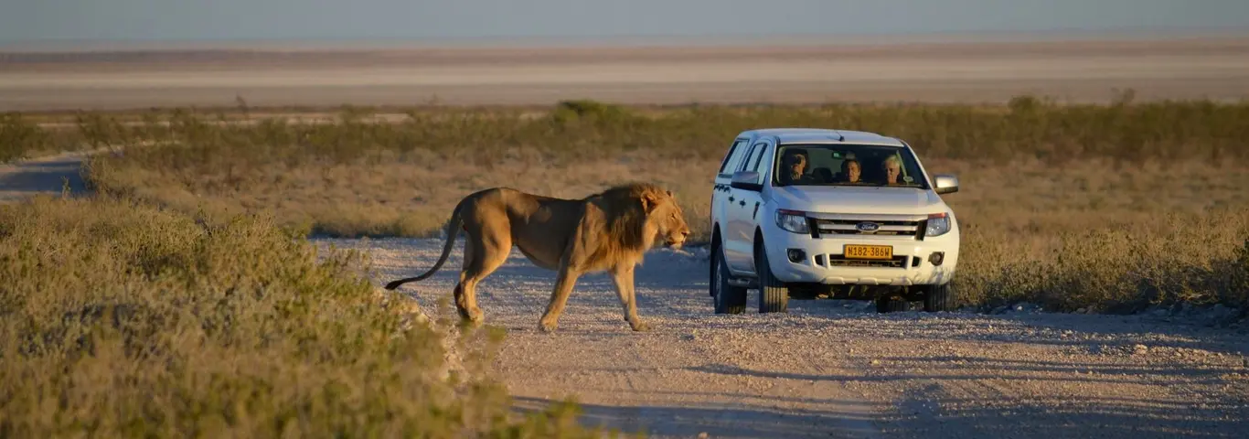 Omdat rijden met de huurauto prima te doen is in Namibië, kun je het Etosha National Park van west naar oost zelf ontdekken tijdens een safari. Voor de allerbeste beleving ga je vroeg op pad, een nieuwe dag in de bush breekt aan, het is nog koel waardoor dieren het meest actief zijn. Neem een picknick mee zodat je op een mooie plek kunt stoppen (let op: niet zomaar ergens de auto parkeren en uitstappen, je bent immers in een wildpark!). Vergeet ook geen verrekijker, zodat je op afstand wild kan spotten. Geef jouw ogen goed de kost want leeuwen verschuilen zich graag in het gras. Een safaritocht reserveren vanuit de accommodatie is ook mogelijk. Met een ervaren gids ga je op pad en volgt de sporen in het zand. Waar die naartoe leiden blijft een spannende verrassing……