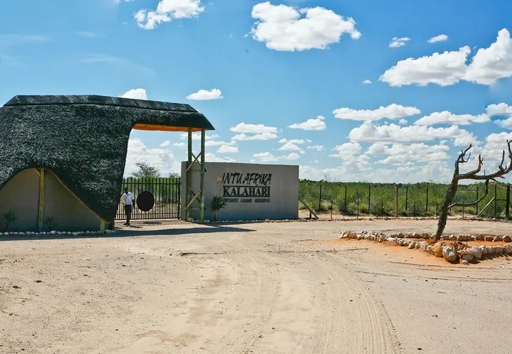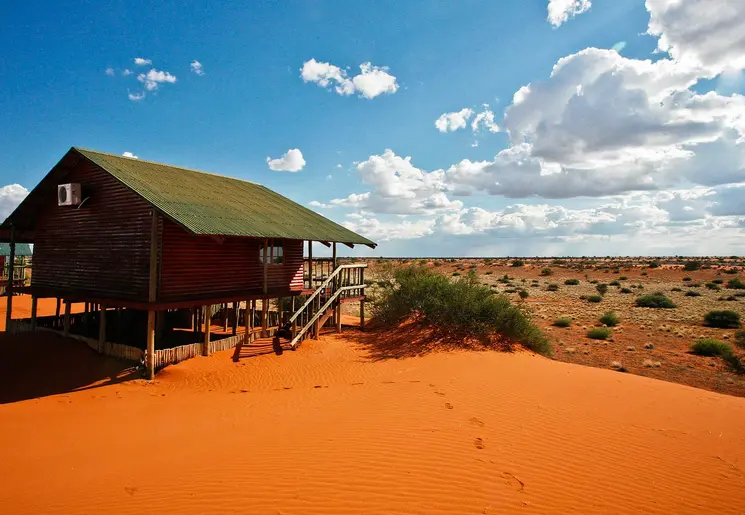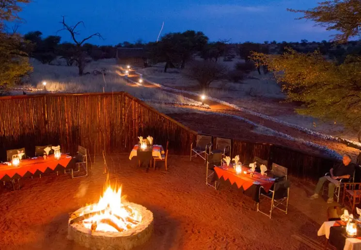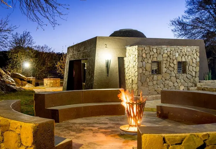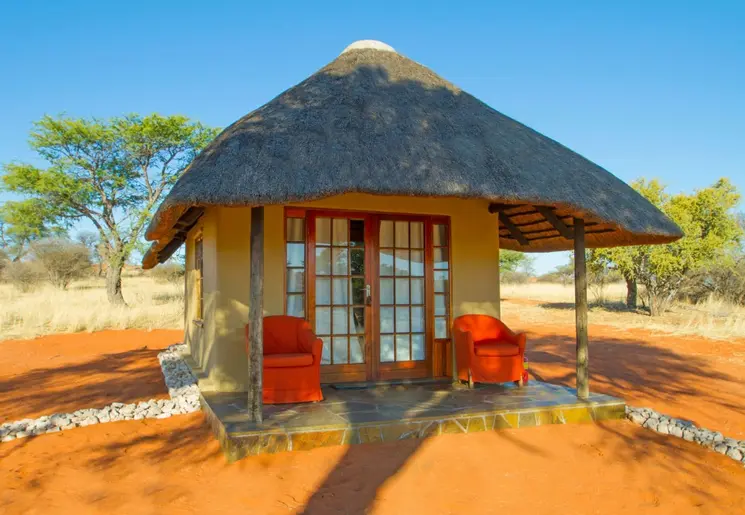 Rustieke ronde huisjes omgeven door open grasland, acacia’s, kameeldoornbomen en rode zandduinen, die ’s nachts in het licht van duizenden fonkelsterren baden. Welkom in de Kalahari.