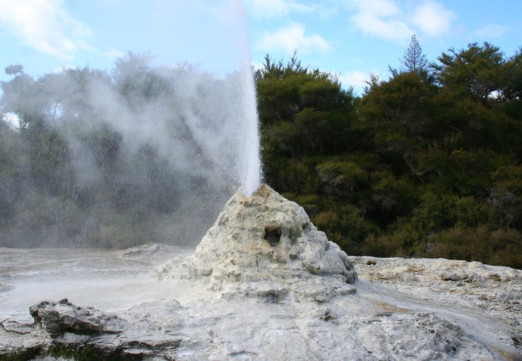 De volgende stop is mijn persoonlijke favoriet: Rotorua! De omgeving hier is zo verrassend, je kijkt je ogen uit. De rotte eieren geur die je welkom heet, neem je al snel voor lief als je op avontuur gaat. Wij begonnen met een wandeling door de stad. Al snel zie je veel Maori-cultuur terug in de bouwwerken, met als hoogtepunt het Rotorua Museum. Als je meer te weten wilt komen over de Maori-cultuur, dan ben je in Rotorua op de juiste plek. Ga dineren bij de Maori, bezoek een Maori-dorp of woon een voorstelling bij. Het laatste heb ik gedaan en natuurlijk is het de bedoeling dat je zelf even meedanst met de Maori! De geothermische activiteiten in de omgeving van Rotorua waren mijn persoonlijke favoriet. Wat is het toch bijzonder hoe veel verschillende natuurverschijnselen er naast elkaar plaats kunnen vinden. In Te Puia komt de Pohutu Geyser 10 tot 25 keer per dag tot uitbarsting. Met veel kracht wordt het water meters hoog de lucht in gespoten!
