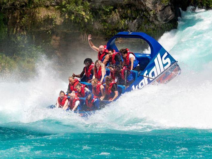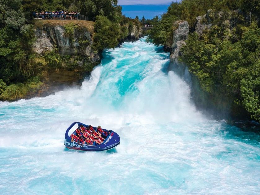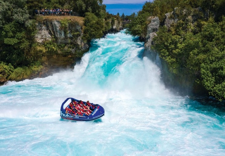 Een must-do voor liefhebbers van adrenaline: een tocht op de Huka Falls Jet! In een onwijs snelle jetboat vaar je 30 minuten over de Waikato-rivier met als einddoel: het bassin van de indrukwekkende Huka Falls, waar ruim 220.000 liter water per seconde meer dan 11 meter omlaag stort. In snel tempo scheur je over het water en langs de waterval. Wees voorbereid op een avontuurlijke rit waarbij je he...
