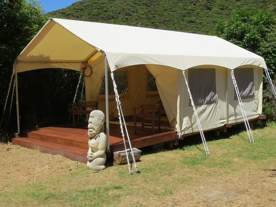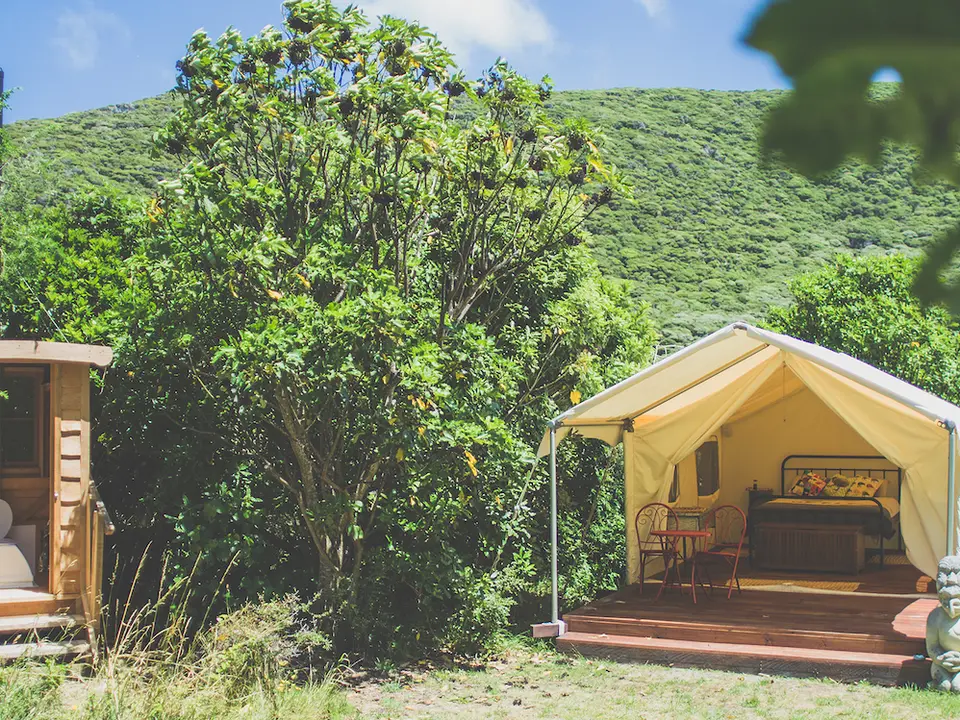 De tenten en cabins zijn gelegen op Kapiti Island, voor de kust van de Kapiti Coast en Wellington. Je bereikt het eiland per boot vanuit Paraparaumu Beach.