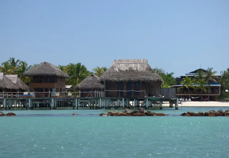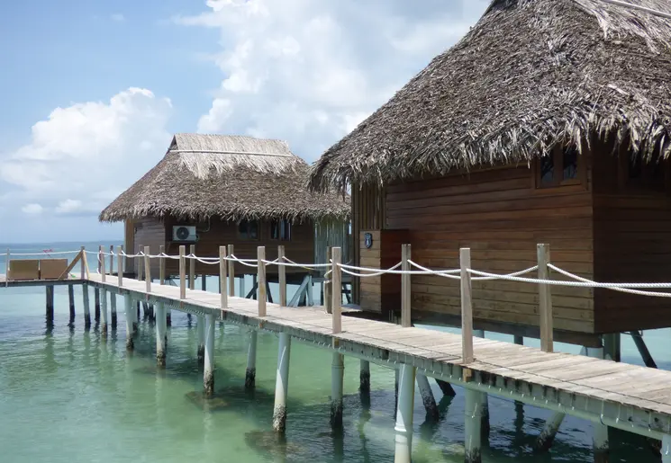 Huisjes op palen in het glasheldere water. Kleinschalig en rustig.