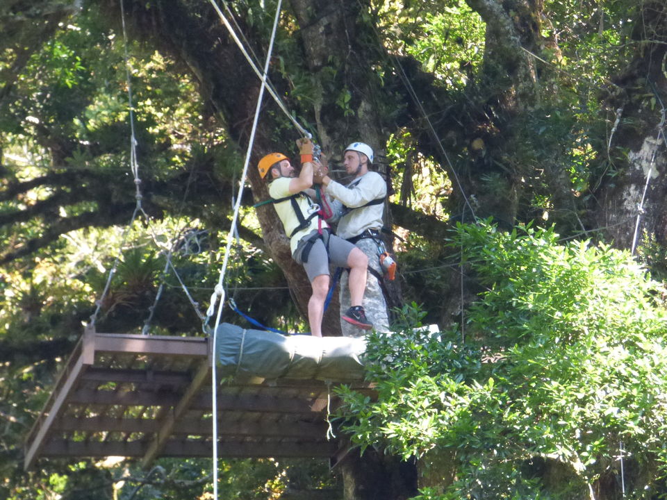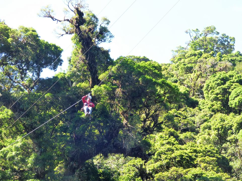 Zweef tussen de boomtoppen van het tropisch regenwoud bij de ziplinetour in de bergen bij Boquete. Je zoeft over rivieren en watervallen. Het parcours is 3 kilometer lang en er zijn 12 kabels tussen 14 platforms gespannen. Je bevindt je aan de rand van het Nationale Park Amistad en in de verte zie je de top van de hoge vulkaan Baru. Vroeger schoten de lokale inheemsen een pijl met een touw naar de...