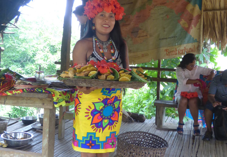 Je rijdt naar de Chagresrivier. Daar staan jongens van de Embera stam te wachten om je met een lange smalle boot door de jungle naar het dorp Quera te varen. De jongens zijn traditioneel gekleed met een soort rokje van kralen. De Embera Indianen houden vast aan hun cultuur en ze dragen hun oorspronkelijke kleding nog steeds bij festiviteiten. In het dorp wachten de vrouwen met hun kleurige rokken ...