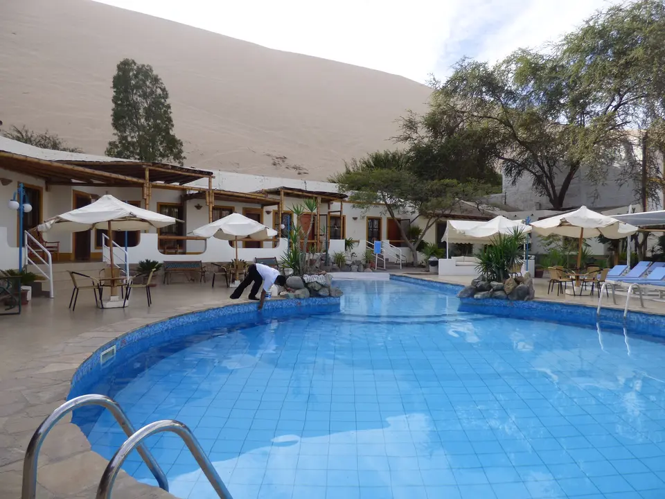 Huacachina is een oase in de woestijn. Het is ook een plaats waar veel jongeren bijeenkomen. Er is veel uitgaansleven. Zeker op vrijdag en zaterdag is het erg druk in Huacachina. Niet alleen toeristen komen er dan, maar ook locals, uit steden in de omgeving. Er is een grote discotheek en er zijn veel bars, en in het weekend is het meestal flink rumoerig in Huacachina. Tot laat lopen mensen op straat en hoor je muziek. Doordeweeks is het een stuk rustiger en je zit wel op een geweldige locatie, op een steenworp afstand van de immense zandduinen en om de hoek bij de lagune. De Hosteria Suiza is trouwens niet in de drukke straten gelegen, maar aan het einde van het dorp in een doodlopende straat. Iets rustiger dus, maar muziek kun je soms wel horen in het hotel.