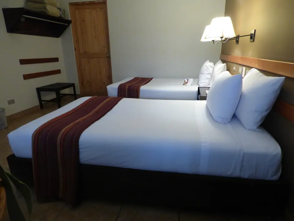 Kamers aan weerszijden van een brede gang met planten. Midden in het centrum van Nazca.