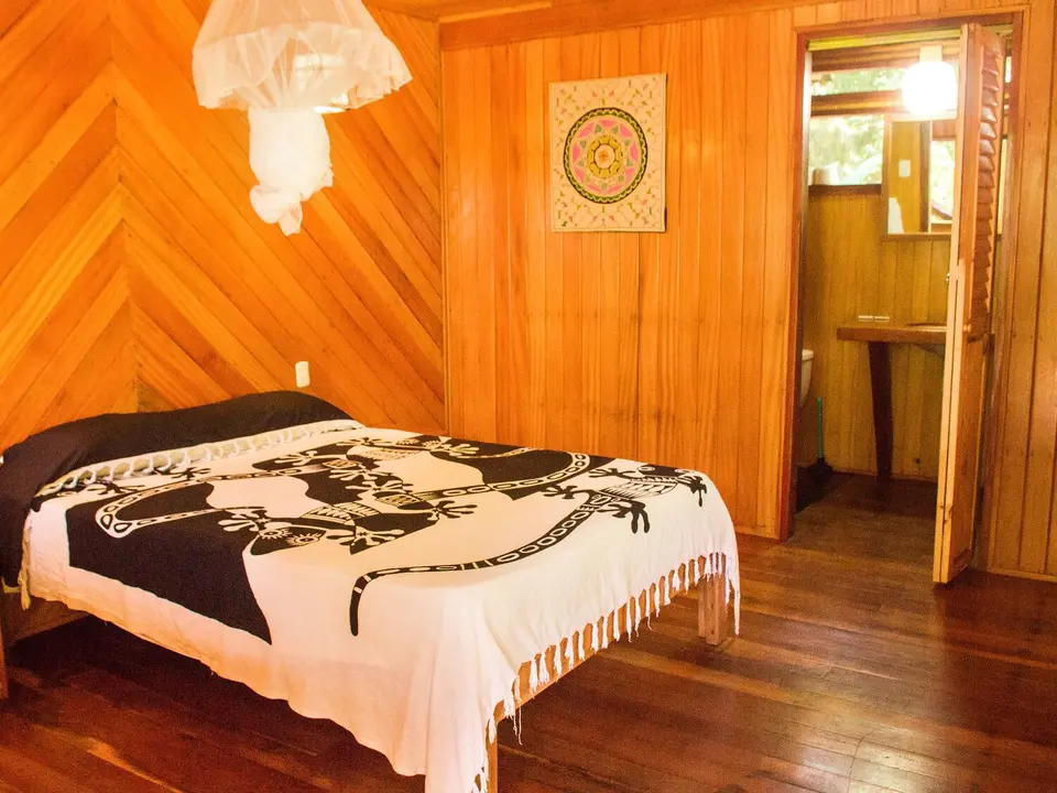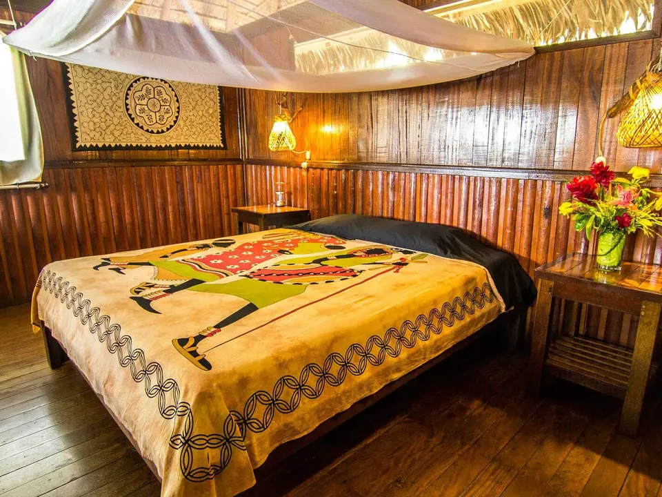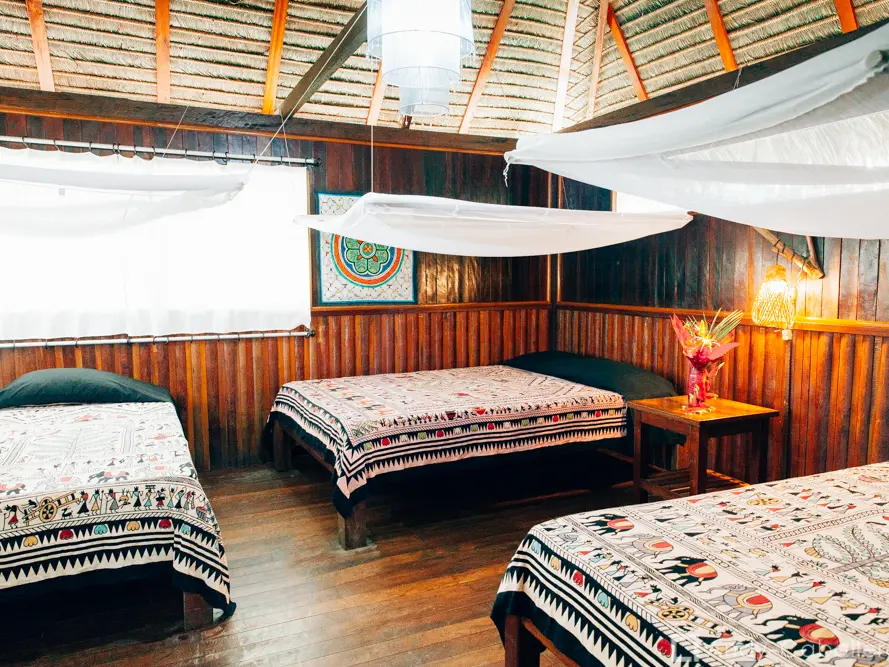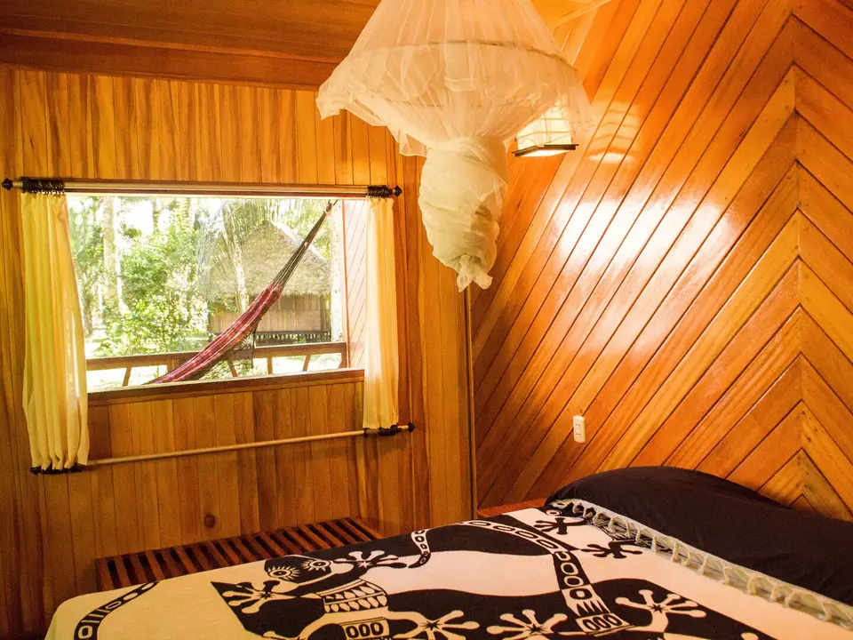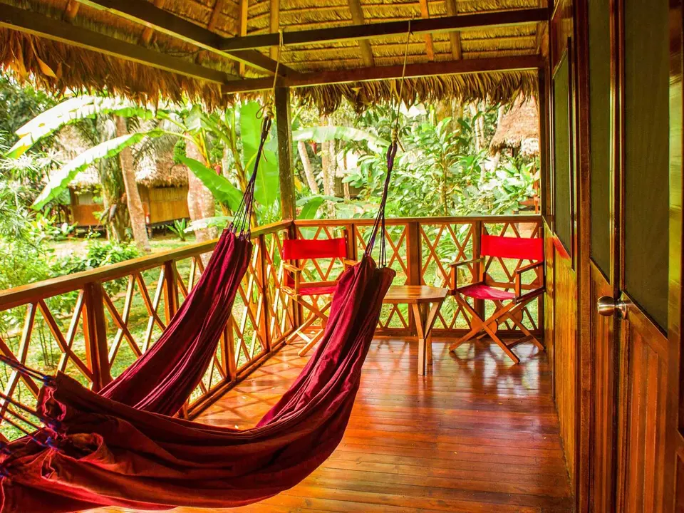 Je slaapt in een houten bungalow met terras. Boven de bedden hangt een klamboe die je beschermt tegen insecten. Op het terras staat een zitje en hangmat, zodat je in alle rust van de omgeving kunt genieten. Je hebt je eigen badkamer en verblijft op basis van volpension in de Corto Maltes Lodge.