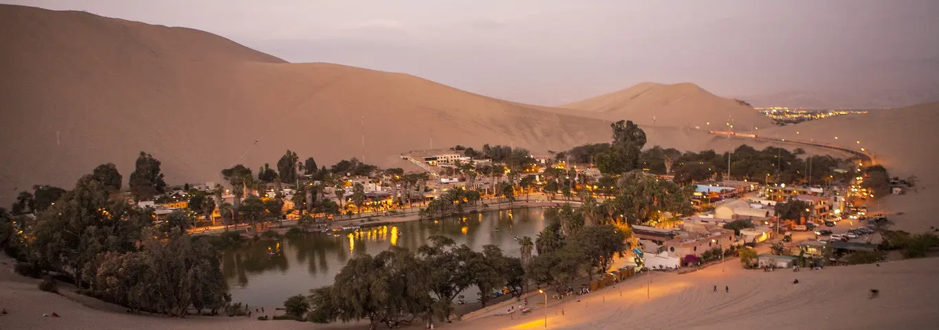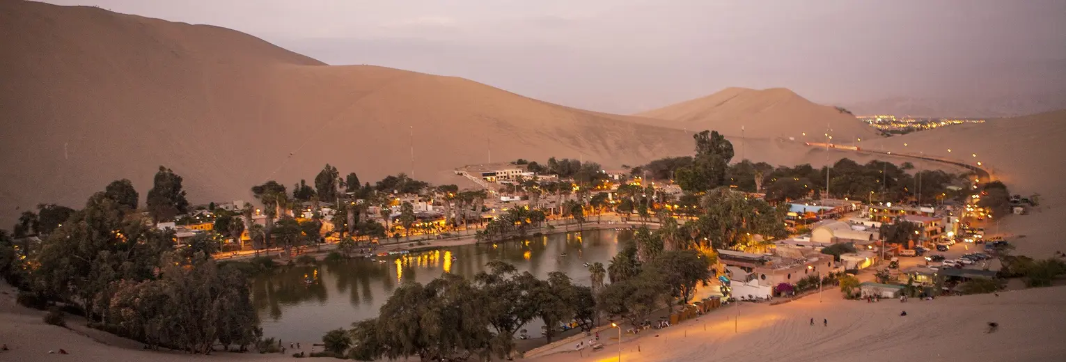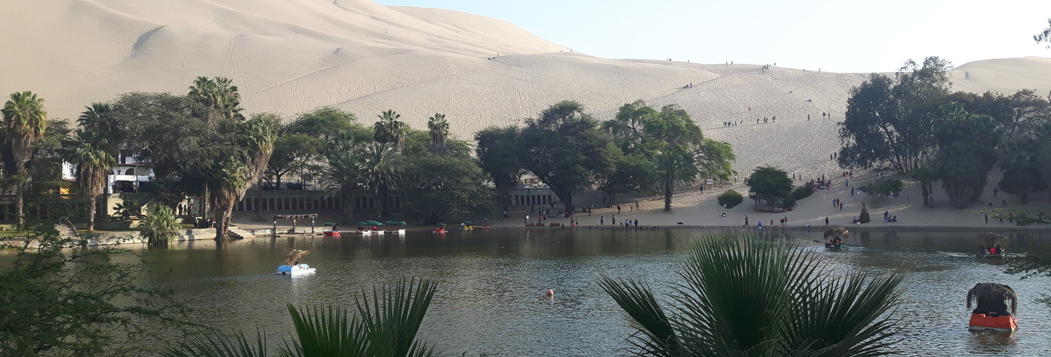 Huacachina is een dorpje in de provincie Ica in het zuidwesten van Peru. Het dorp is omgeven door spectaculaire zandduinen. In het midden van het dorp ligt een meertje met palmbomen er omheen. Een heuse oase! Sandboarden en buggy rijden zijn dé activiteiten van deze plek. Maar u kunt er ook voor kiezen om lekker te ontspannen bij het meer.