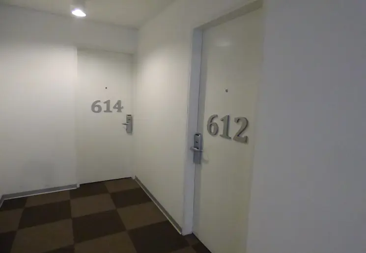 Kamers aan weerszijden van een brede gang met planten. Midden in het centrum van Nazca.