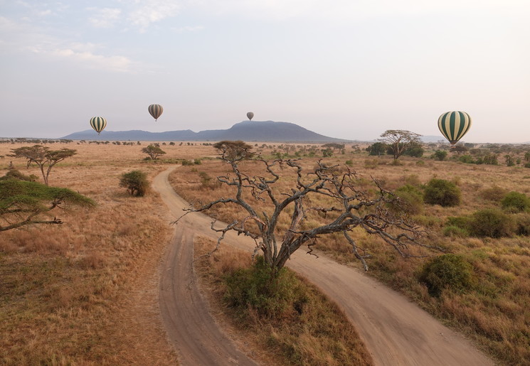 Nog zo’n unieke belevenis is om vanaf grote hoogte de zon op te zien komen in de Serengeti! Ik word rond de klok van 05.00 uur opgehaald en naar het vertrekpunt van de ballonvaart gereden. De mannen waren al druk bezig om alles in gereedheid te brengen. Na de briefing gaan we liggen in ons compartiment in de ‘mand’. Daar gaan we…..langzaam stijgen we op en voor ik het weet heb ik schitterend uitzicht op de vlaktes beneden mij. Staat daar nu een kudde olifanten? Ja hoor, ik zie zelf de kleintjes spelen, hoe bijzonder is dat. Even verderop staat een ‘tower of giraffes’ rustig te eten aan een acaciaboom.