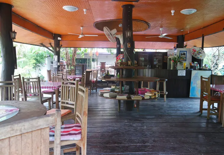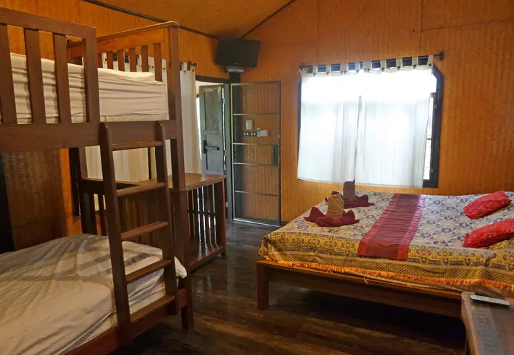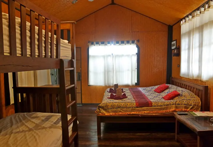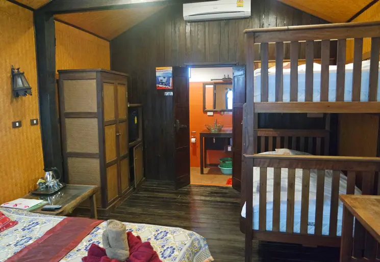 Welkom in dit paradijsje! Je slaapt vanavond in een bungalow op palen, ongeveer 2 meter boven de grond. De bungalows zijn gebouwd van gerecycled teakhout volgens de traditionele Thaise bouwstijl. Vanaf je balkon kijk je uit over de groene tuin en het zwembad. Tussen de palen onder de bungalow hangen hangmatten om te relaxen.
