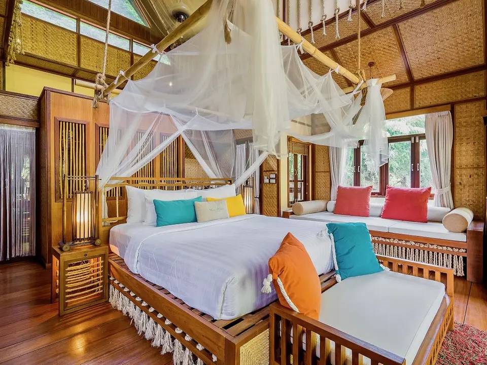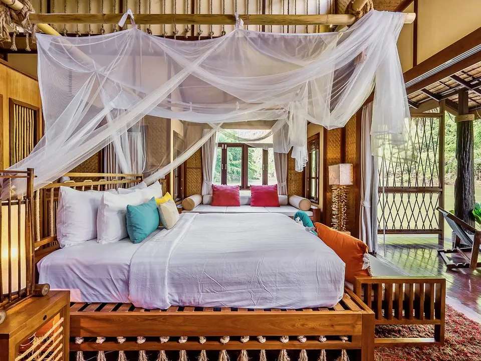 Het resort beschikt over grote, sjieke en stijlvolle bungalows met terras. De decoratie is typisch Thais design met teakhouten meubelen en kleurrijke kleden. Alle faciliteiten van een viersterren hotel zijn aanwezig: kingsize bed (of twee aparte bedden), een televisie met dvd-speler, gratis wifi, badkamer met regendouche en warm/koud water, airconditioning, koffie- en thee faciliteiten, kluisje, koelkast en minibar, haardroger, telefoon en dagelijks gratis drinkwater. Op je privé-veranda aan het water is het een genot om te luisteren naar de junglegeluiden.