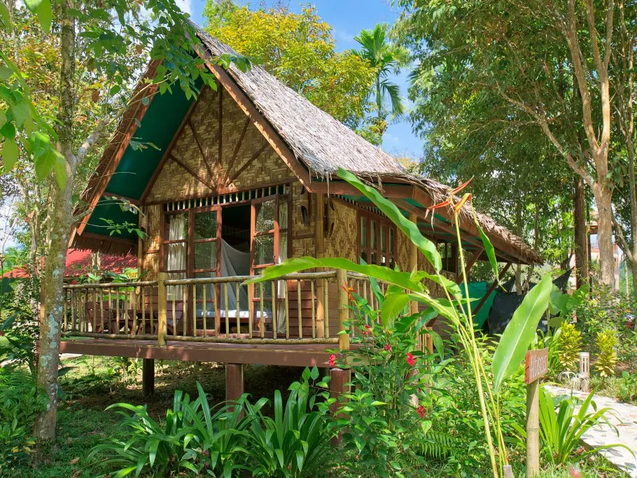 Naast boomhutten zijn er ook bungalows, dus wat lager gelegen bij de grond. Ideaal voor bezoekers die wat minder goed trappen kunnen oplopen of die willen genieten van het uitzicht op de tuin met bloemen en planten of bij de rivier.