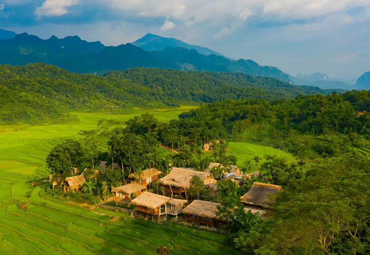 Je wordt opgehaald bij je hotel en rijdt in ongeveer 4 uur naar Pu Luong. De omgeving wordt heuvelachtig en groen. Rond lunchtijd ben je in Pu Luong. Na de lunch trek je je wandelschoenen aan. Vanaf de lodge wandel je over landweggetjes langs rijstterrassen, visvijvers, groentetuintjes en door dorpjes waar de mensen in huizen op palen wonen. Bestudeer een typisch waterrad van Pu Luong om te zien hoe het water vanuit de rivier door het rad en via bamboe aquaducten verplaatst wordt naar de rijstvelden. Na ongeveer 3 uur wandelen (12 kilometer) stap je op een bamboevlot met afdakje. Met een grote stok duwt de bootsman het vlot door het water. Tip: trek zwemkleding aan want je kunt bij een stroomversnelling een verfrissende duik nemen. Terug naar de lodge voor het diner.