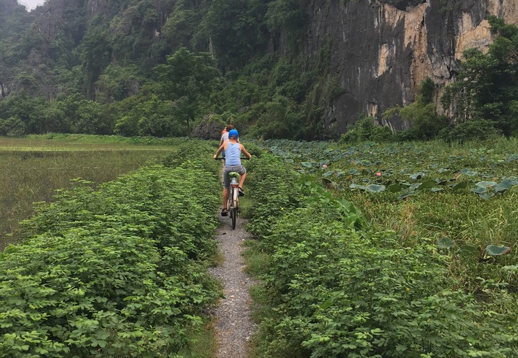 Eerst naar de overblijfselen van de eerste hoofdstad van Vietnam, Hoa Lu. Hier werden de vroegere koningen Dinh en Le aanbeden. Wandel op je gemak door tuinen, langs beelden en vijvers en bewonder de kleurrijke tempels. Bij de volgende stop stap je in een roeibootje voor een tocht van 2 uur. Je wordt op de traditionele wijze geroeid: met de voeten! De route volgt een waterweg door een landschap met rijstvelden, weelderig begroeide kalkstenen rotsen en door 3 grotten. Na de boottocht kun je op eigen kosten gaan lunchen. Daarna staan er fietsen klaar en maak je een ontspannen fietstocht naar de tempels van Bich Dong. Vanaf Bich Dong naar de Thai Vi tempel. Bespreek met je gids hoe lang je wilt fietsen.