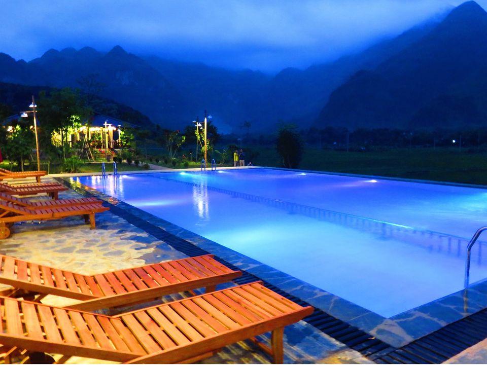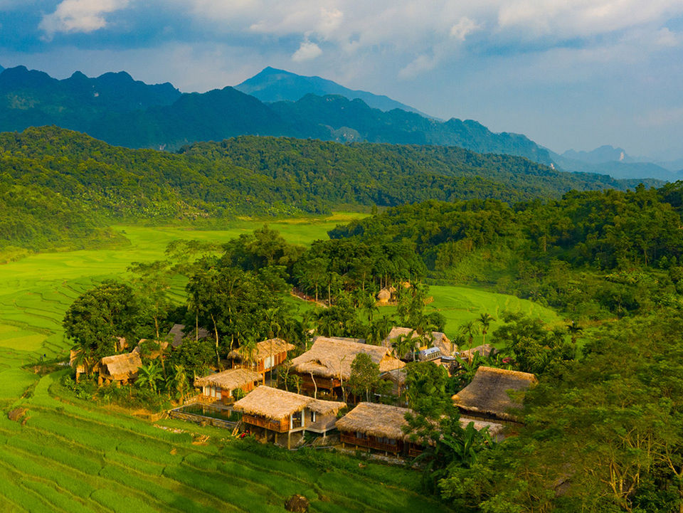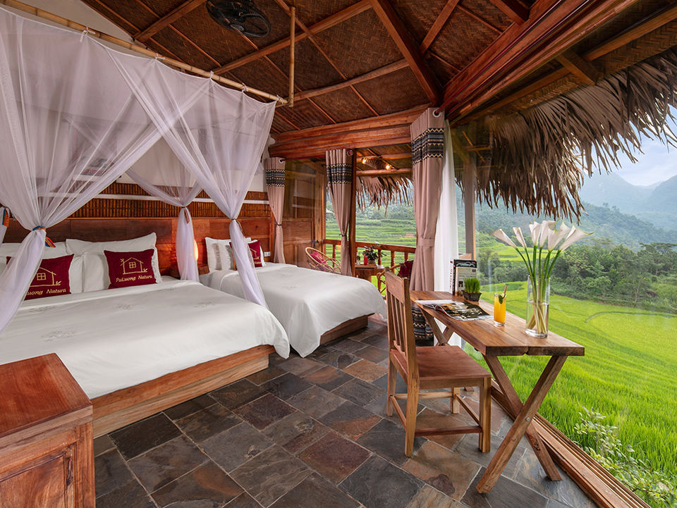 De houten bungalows van Pu Luong Natura liggen aan de rand van een vallei met eindeloze rijstterrassen. Vanuit één van de twee infinity zwembaden én vanaf je balkon heb je er weids uitzicht over. Hoewel het resort tegen een heuvel ligt, liggen de kamers en faciliteiten op één niveau; je hoeft dus niet veel te klimmen/dalen. Verspreid over het resort vind je uitzichtpunten, een schommelbank en...