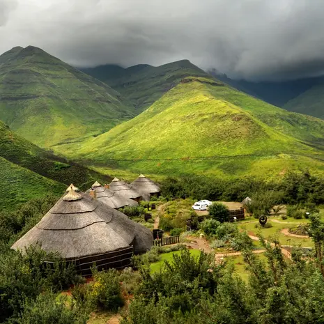 De hutjes en huisjes van de hooggelegen Malealea Lodge zijn vrij eenvoudig, de ligging daarentegen is adembenemend met weids berglandschap en schilderachtige dorpjes waar de Basotho-bevolking leeft.