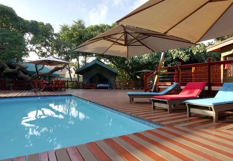 Liever wat rustiger aan doen? Het grote zwembad is een heerlijke plek voor een verfrissende duik, onder het toeziend oog van rondzwervende wrattenzwijntjes die hier rondscharrelen.