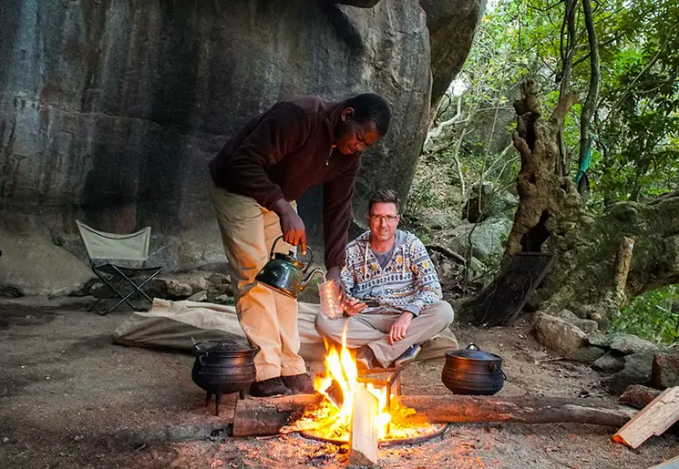 De zon en de vogels in de bush wekken jullie al vroeg. De kunst is nu om het vuur weer aan te krijgen met de kooltjes van de avond ervoor. Zodra het brandt, gaat de ketel erop, zodat er koffie en thee kan worden gezet. Na het grillen van wat tosti’s boven het vuur is het tijd om terug te keren naar de bewoonde wereld en jullie reis naar Zuid-Afrika te vervolgen.