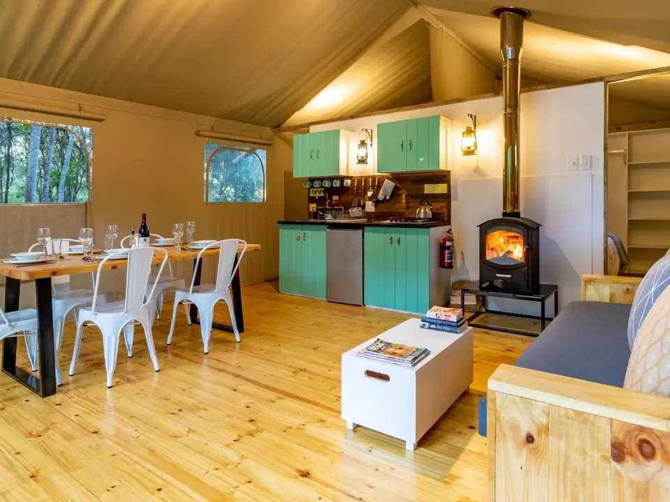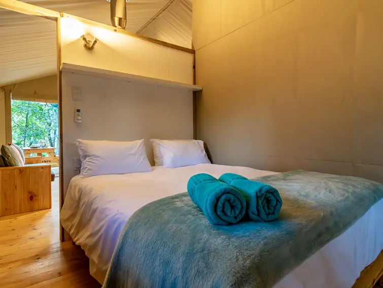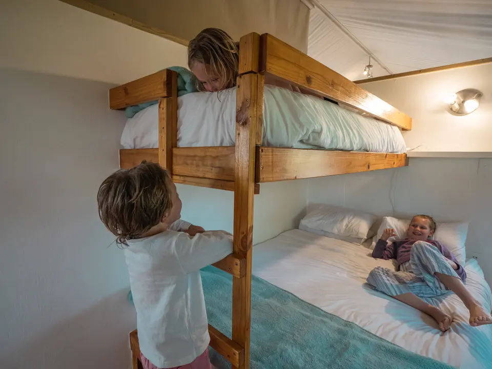 Je tent is voorzien van alle gemakken, waaronder een keuken, douche, toilet, fijne zithoek, airconditioning, elektriciteit, (warm) stromend water en een openhaard. Elke tent heeft 2 extra lange tweepersoonsbedden en een eenpersoonsbed voor maximaal 5 personen. Je verblijf is op basis van logies en ontbijt. We kunnen ook lunch- en dinerpakketten verzorgen. Een barbecue-pakket met onder andere vlees, boerewors, kip, salade, aardappel in folie en brood kost circa € 17 per persoon. De pakketten worden bij je tent afgeleverd. Graag bij boeking doorgeven.