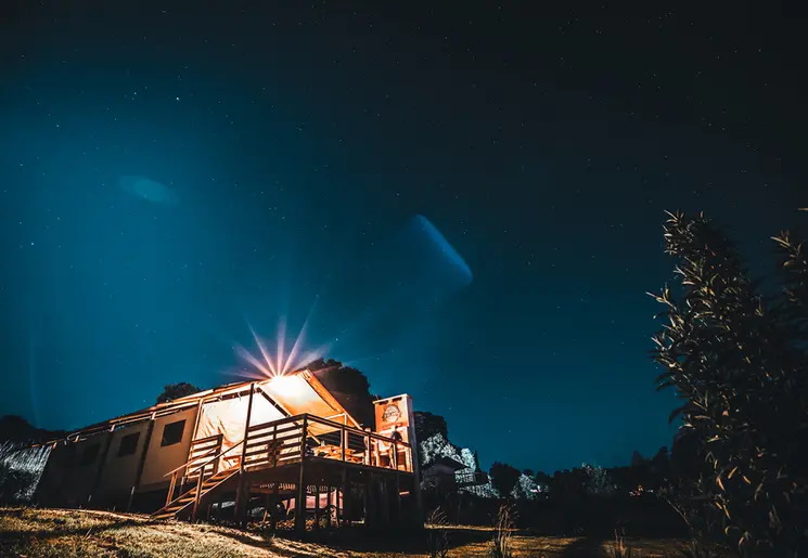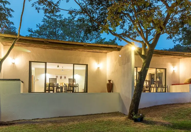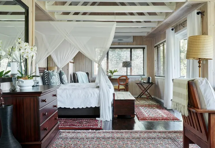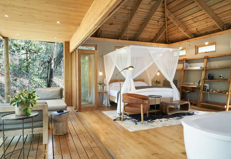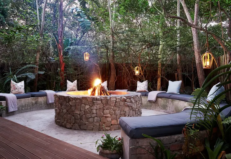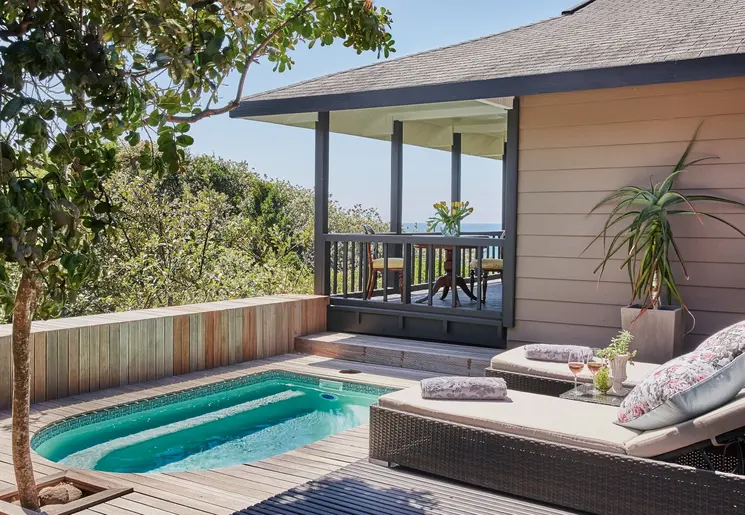 Prana Lodge is een idyllische schuilplaats in een dicht privéduinwoud aan de woeste Wild Coast. Een houten looppad door het bos en over de zandduin leiden je direct naar het verlaten strand.