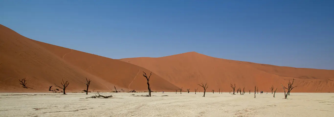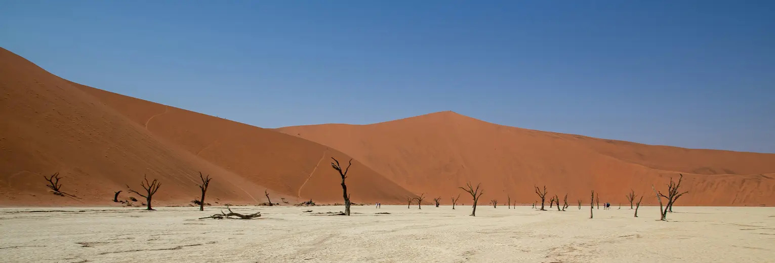 Bij Deadvlei komt het kleurenpalet het mooiste uit: rode duinen, een witte kleigrond, een strakblauwe hemel en bruine, kale kameeldoornbomen.