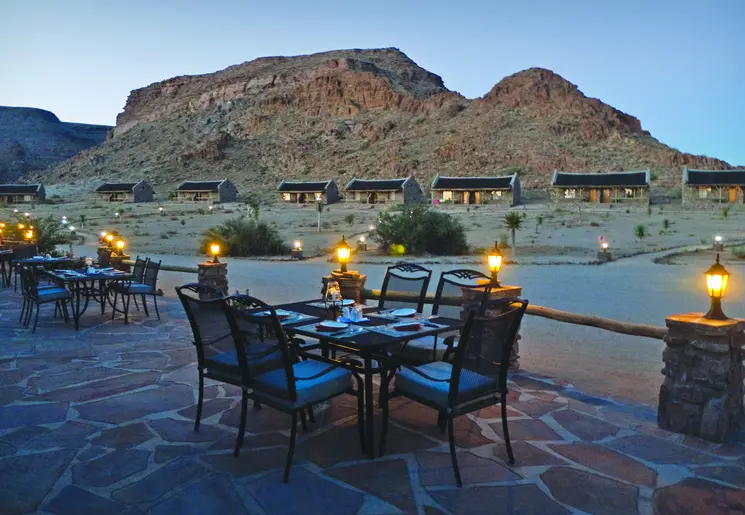 Fish River Canyon is het grootste ravijn in Afrika en na de Grand Canyon in Amerika het grootste ravijn ter wereld. Het ravijn maakt deel uit van het Ai-Ais/Richtersveld Transfrontier Park. De adembenemende kloof is 160 kilometer lang, 27 kilometer breed en 550 meter diep. Volgens de Bosjesmannen heeft een voortvluchtige slang dit natuurfenomeen veroorzaakt. Tegenwoordig zijn de waterpoelen in de kloof thuis van vissen en leguanen. Op de rotsvlaktes leven verder klipspringers, grondeekhoorns en bavianen, en er zijn sporen gevonden van luipaarden en bergzebra’s. Kijk niet alleen naar beneden, maar ook naar boven: talloze soorten vogels fladderen hier, waaronder de eremomela en de broebroe. In de Fish River Canyon komt de kokerboom voor, de nationale boom van Namibië.